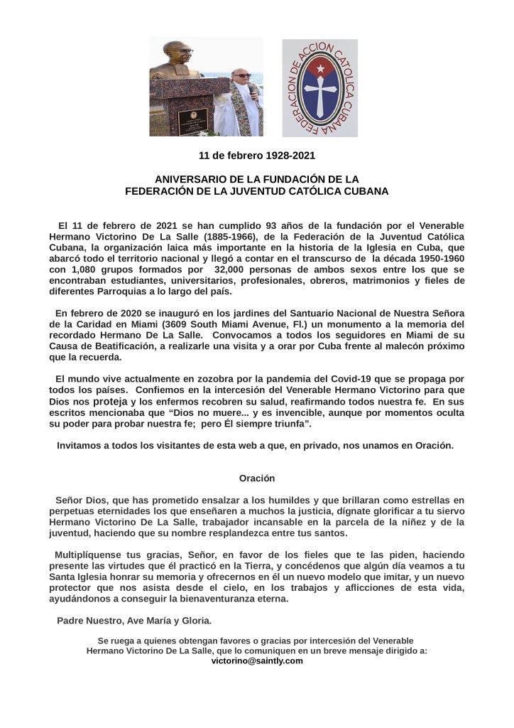 1928-2021 Aniversario de la fundación de la Federación de la Juventud Católica Cubana Publicado el 11 febrero, 202111 febrero, 2021 por victorinodelasalle Comparte: Haz clic para compartir en X (Se abre en una ventana nueva) X Haz clic para compartir en Facebook (Se abre en una ventana nueva) Facebook Me gusta Cargando...